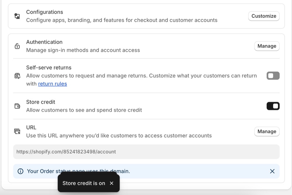 Store credit is activated by default on Shopify stores. Store owners can control whether it displays as a payment method through Customer accounts settings.